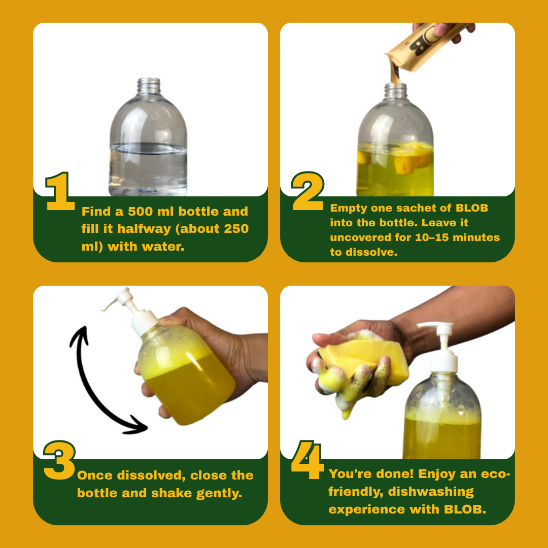 - You're done! Enjoy an eco-friendly, guilt-free dishwashing experience with BLOB.