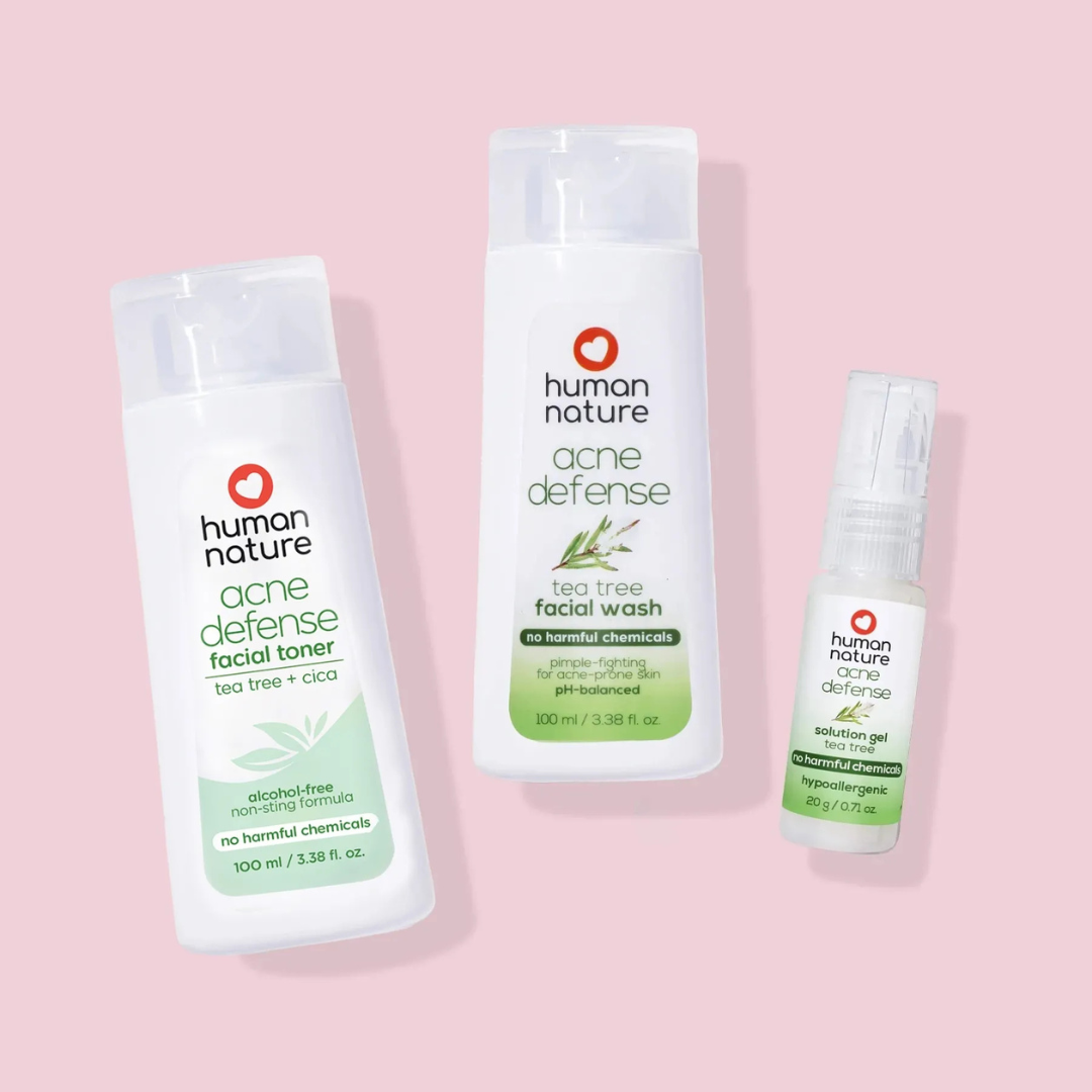 *Based on an independent clinical study comparing pimples observed among users of Human Nature Acne Defense Solution Gel and popular chemical acne treatment brands
