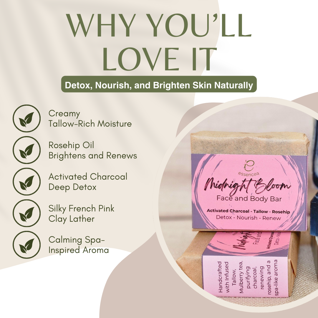 Essencia Midnight Bloom Face and Body Bar is a luxurious tallow-based cleanser infused with activated charcoal, rosehip, and French pink clay to detoxify, brighten, and soften the skin. The rich tallow formula provides deep, creamy moisture, while rosehip-infused oil supports renewal and radiance. Activated charcoal purifies thoroughly without stripping, and pink clay adds a silky, spa-like feel to every wash. Finished with a soothing essential oil blend, this bar turns your daily cleansing into a calming ritual of purity and restoration.