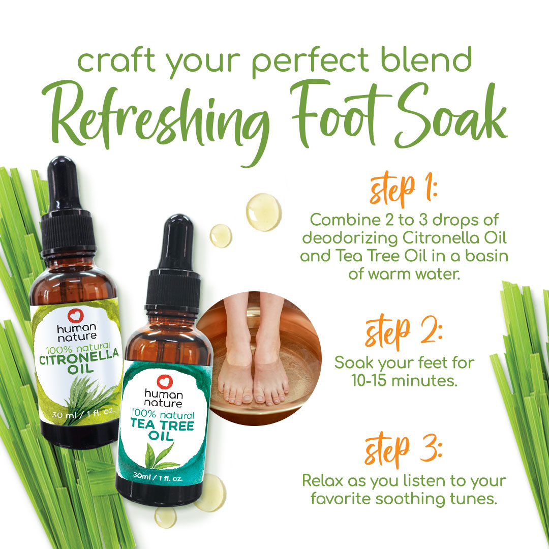 Combine a few drops of Citronella Oil and Tea Tree Oil in a basin of warm water. Soak your feet for 10-15 minutes and relax while listening to your favorite soothing tunes. PRO TIP: For a euphoric head-to-toe spa, soak your feet while treating your tresses with our Daily Hair Treatment and pampering your face with our Detoxifying Mask + Scrub.