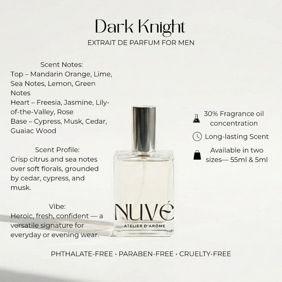 NUVÉ Atelier D'Arôme Dark Knight Extrait de Parfum for Men is a bold yet refined fragrance crafted for the man who leads with presence, not noise. This extrait de parfum opens with a sharp surge of mandarin orange, lime, lemon, sea notes, and green notes—crisp, invigorating, and unmistakably fresh. The heart introduces a disciplined balance of freesia, jasmine, lily-of-the-valley, and rose, adding subtle elegance without softening its strength. As it settles, cypress, musk, cedar, and guaiac wood create a deep, smoky-woody base that feels protective, grounded, and quietly powerful.