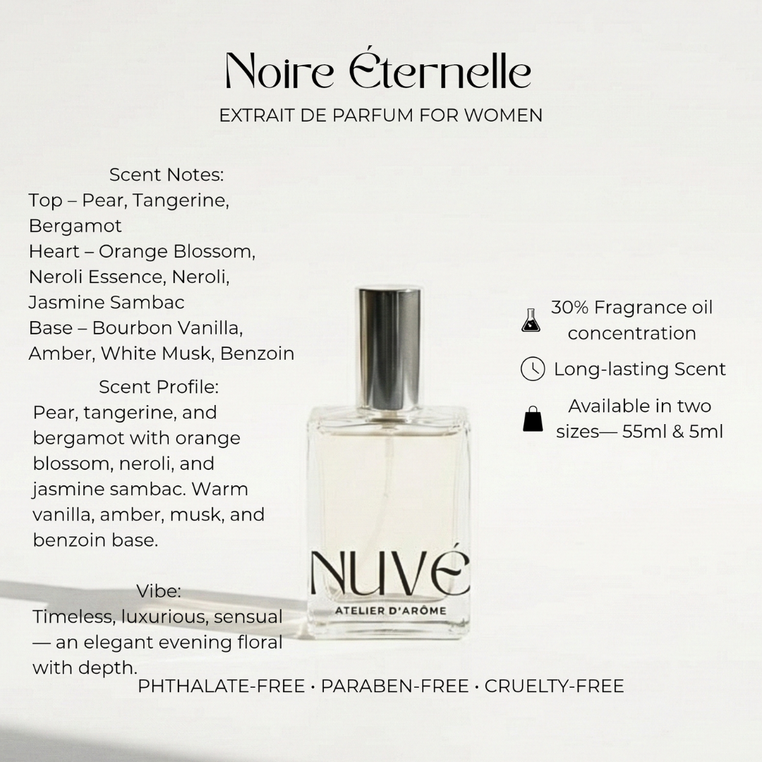 NUVÉ Atelier D'Arôme Noire Éternelle Extrait de Parfum for Women is a sensual, elegant evening fragrance that embodies quiet power and lasting allure. This extrait de parfum opens with a luminous contrast of pear, tangerine, and bergamot—bright yet refined, cutting through the darkness with confidence. At its heart, orange blossom, neroli essence, neroli, and jasmine sambac unfold into a creamy, intoxicating floral core. As it settles, bourbon vanilla, amber, white musk, and benzoin wrap the skin in a warm, velvety trail that feels deep, luxurious, and unforgettable.